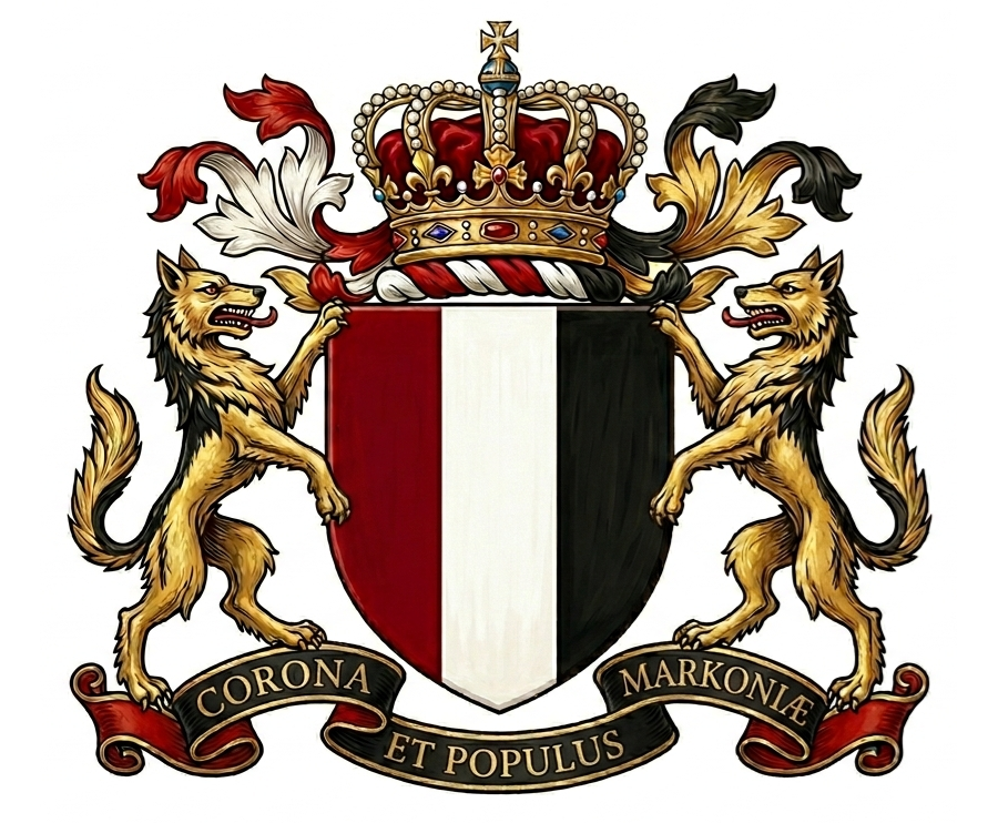 A scroll Gules fimbriated Or, inscribed with the motto “CORONA ET POPULUS MARKONIÆ” in letters Or.